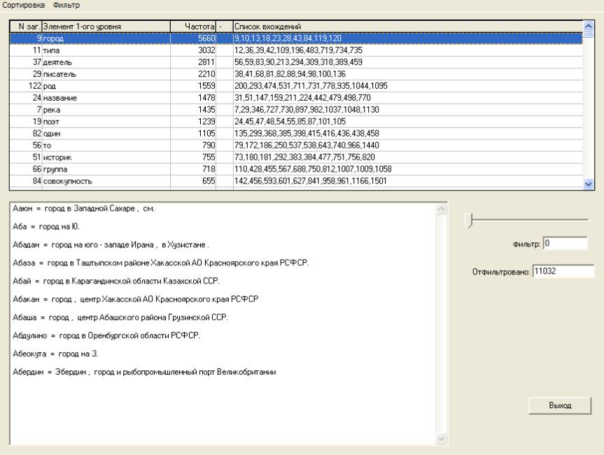 Элементы отфильтрованы по частоте вхождения в именную группу, выделенную автоматически в качестве описания (возможного) входного понятия (также возможного). Список вхождений содержит номера первых заголовков (именнных групп), а входные понятия и тексты именных групп (из списка вхождений). Применяемые при автоматическом выделении алгоритмы не были оформлены как эвристики, скорее их следует трактовать как “врожденные” механизмы для примитивного быстрого начального анализа, дающего лишь первое приближение и безусловно требующего уточнения в дальнейшем.