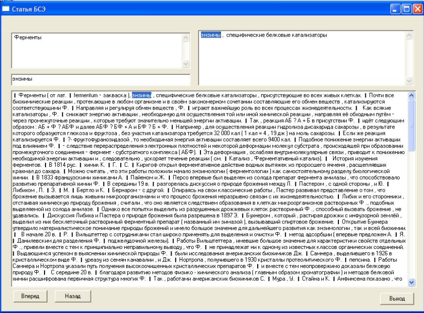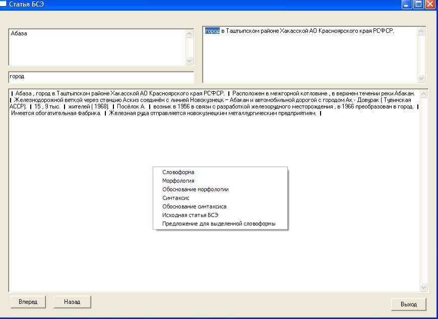 На рис. 2 приведено окно, вызываемое для выбранного элемента 1-ого уровня. Верхние панели отражают, соответственно, входное понятие, именную группу (обычно этот 1-ое предложение) и элемент иерархии. Нижняя панель содержит предложения статьи БСЭ (ограничение по общей длине текста). Центральная часть этой панели иллюстрирует вызоы меню, смысл которого в основном очевиден из пунктов. Исключение представляет лишь пункт “Исходная статья БСЭ”, выбор которого загружает WORD-файл с исходным текстом стать БСЭ.